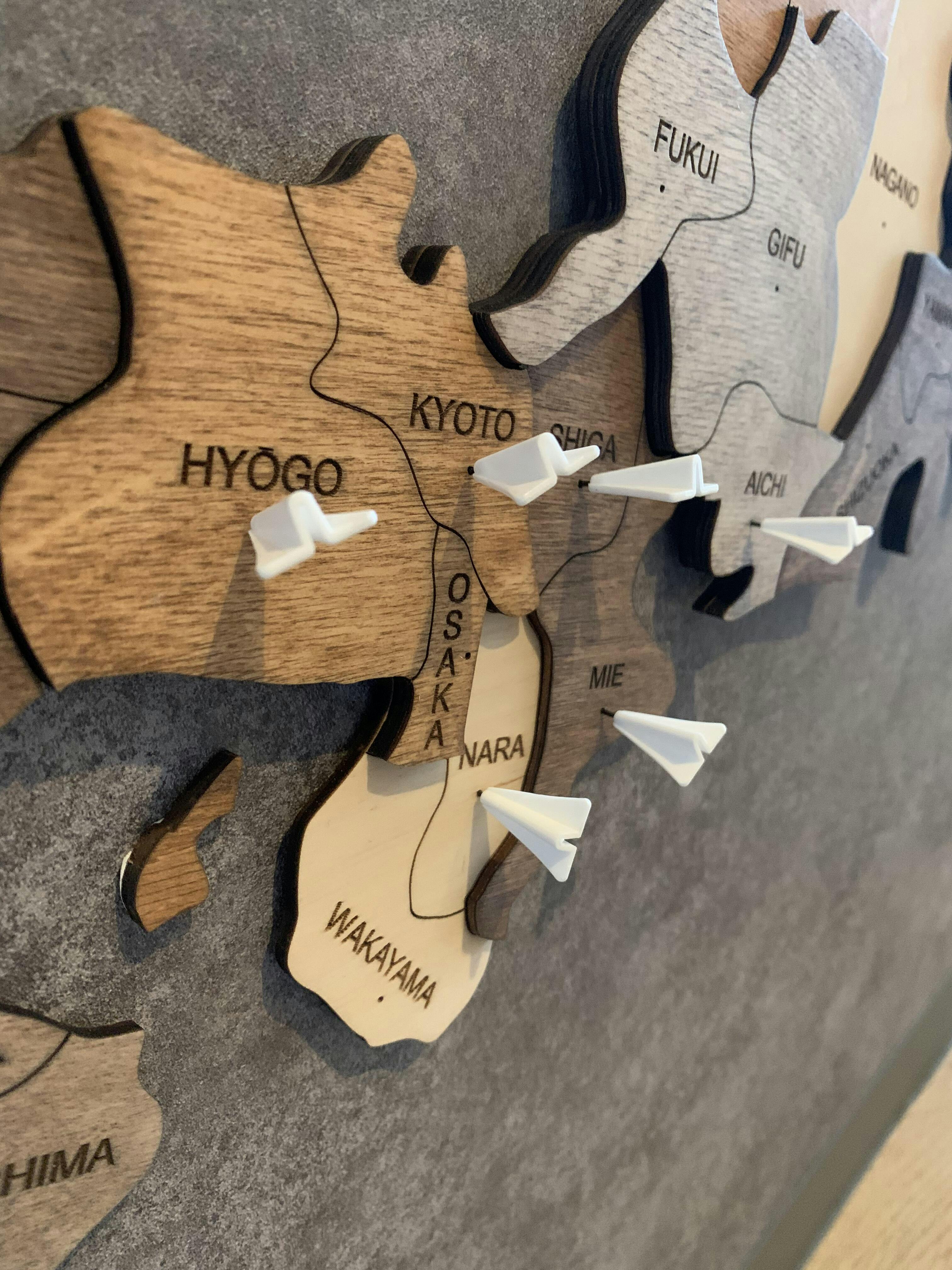 木製日本地図とセットで紙飛行機型のピンを購入しましたが、本当に買って良かったと思います! 3歳の息子でも「紙飛行機だね〜」と形を理解していて、旅行の思い出を話しながらピンを刺す時間は家族にとって楽しいひとときになりました。