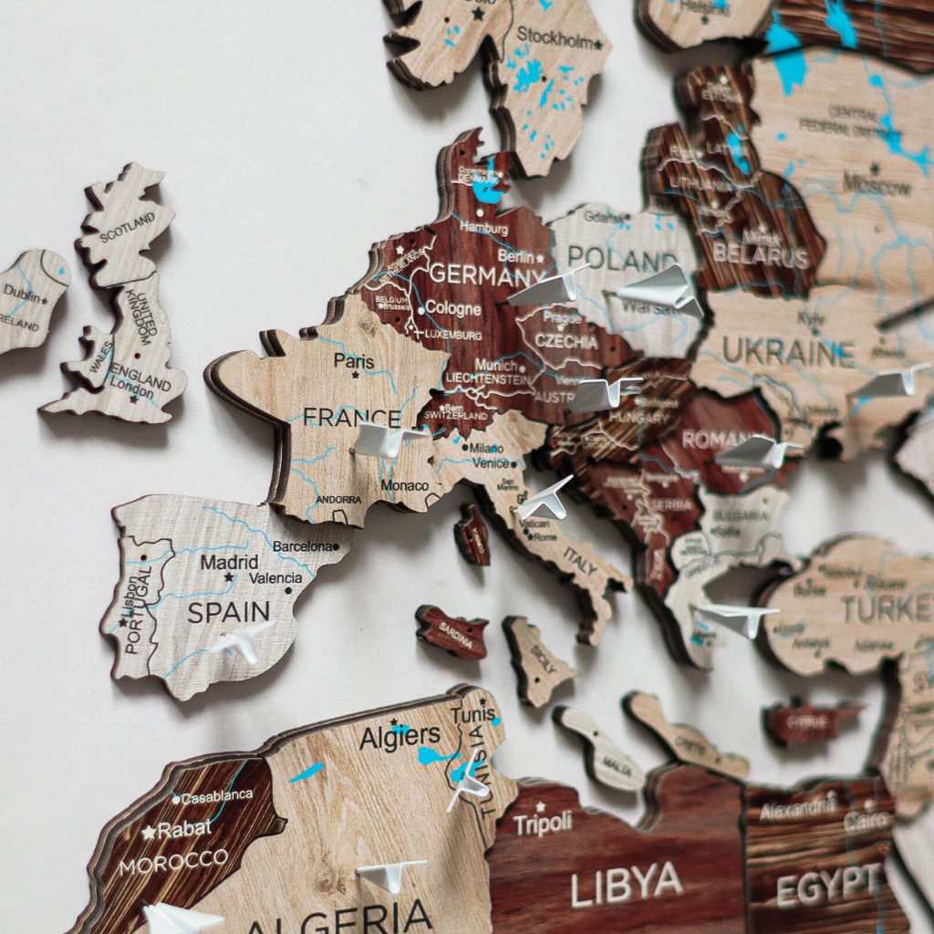 カプチーノのLサイズを購入しました。最初は値段を見てちょっと悩んだのですが、ウクライナ製という点と、品物自体がとても素敵だったので。以前から壁に世界地図を貼って、これまで行った国や地域をピンで留め、どんどん増やしていきたいという思いにもぴったりでした。カプチーノは、他のタイプより情報が多かったのと色が素敵だった一方、川や湖のビビッドな青は心配でしたが、デザイン的にも良かったです。壁に貼るのはパッとはいきませんが、一人でも想像以上に早くできました。ひっつき虫も役に立ちました!まだ飛行機や船などは置けていませんが、今からどこに置こうか楽しみです。ウクライナに早く平和が戻るよう、心から祈っています。